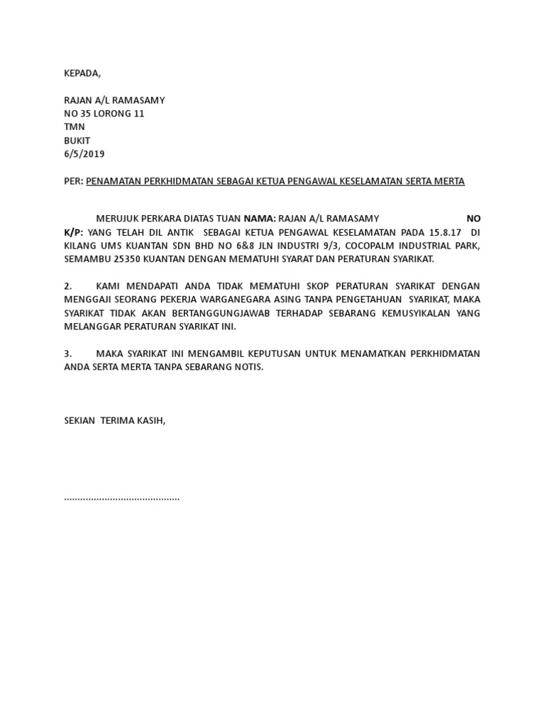 Berikut contoh surat pengunduran diri yang dapat anda jadikan contoh surat berhenti kerja yang baik dan sopan. Sebelumnya telah dibahas mengenai surat keterangan bekerja dengan bahasa inggris. Dengan ini mengajukan surat permohonan untuk bekerja di perusahaan bapak/ibu sebagai financing manager. Demikian surat pernyataan ini saya buat dengan sadar dan sesuai keadaan yang sebenarnya. Surat amaran (bilangan surat amaran ini bergantung sama ada kesalahan masih berulang atau tidak, jadi sesebuah syarikat boleh mengeluarkan surat contoh surat amaran dibawah sesuai digunakan bagi menegur pekerja dengan cara yang lebih telus dan berkesan.
